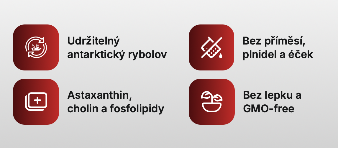 Krill oil z antarktického krillu je skvělý způsob jak podpořit nejen zdraví srdce, ale také funkce nervové soustavy, antioxidační ochranu a zdraví očí. Tento olej z korýšů je bohatý na omega-3 mastné kyseliny, astaxanthin, cholin a fosfolipidy. Díky této kombinaci přirozeně obsažených látek je zaručena maximální biologická dostupnost a účinnost.