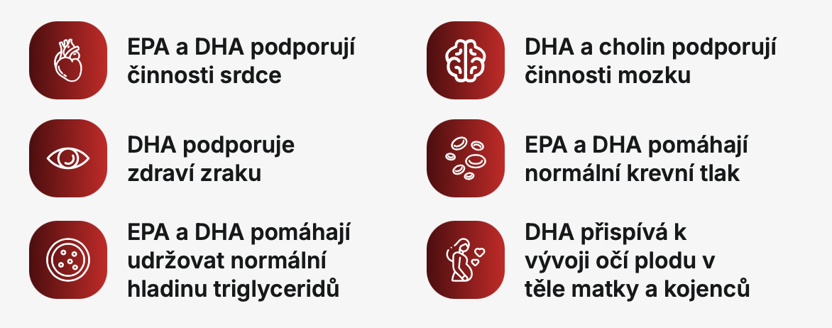 EPA a DHA jsou v krillovém oleji vázané na fosfolipidy, díky čemuž mají maximální biologickou dostupnost. Krom toho však fosfolipidy hrají také kritickou roli ve struktuře a funkci buněčných membrán. Krill oil obsahuje také cholin, který podporuje zdraví kardiovaskulárního systému a je využíván při syntéze acetylcholinu - neurotransmiteru. Ten je důležitý především pro zdravé fungování nervové soustavy.