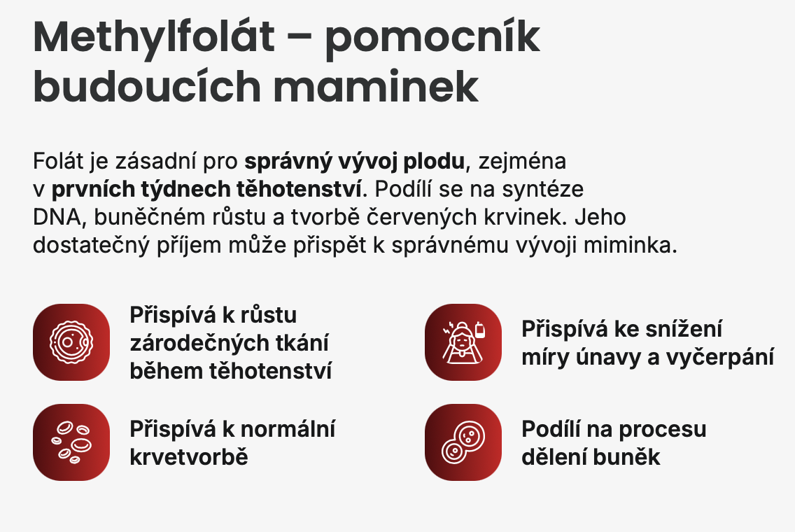 Methylfolát od Natios dodává už aktivní patentovanou formu 5-MTHF Quatrefolic®, kterou tělo dokáže okamžitě vstřebat a využít bez jakýchkoli metabolických překážek.