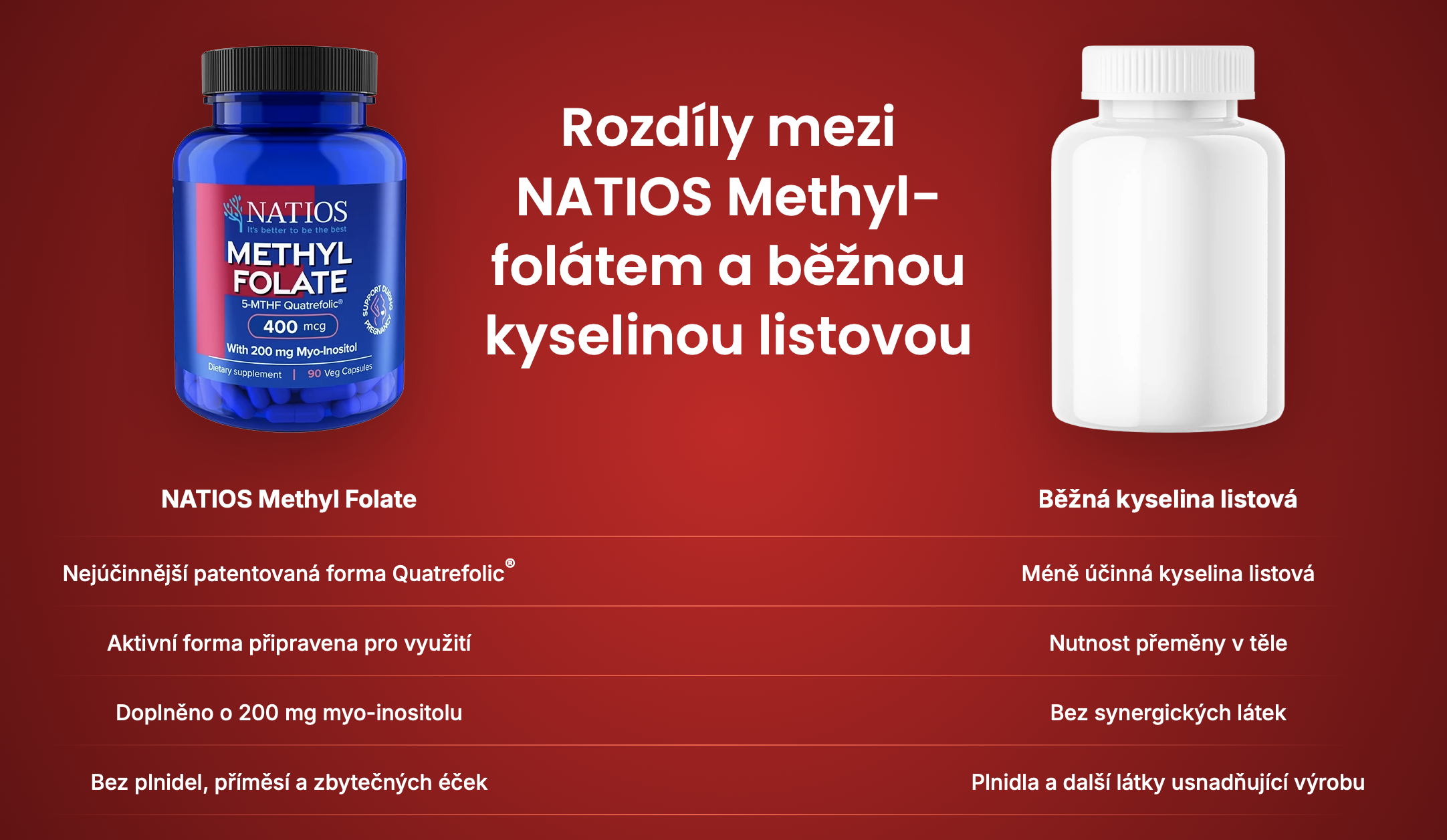Prémiový zdroj kyseliny listové, který vaše tělo okamžitě využije. Natios poskytuje aktivní formu methyl folátu Quatrefolic®, který je biologicky dostupnější a účinnější než běžná kyselina listová.